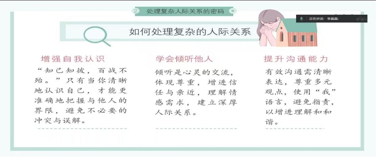 本次讲座聚焦于大学生人际交往的典型困惑和问题,内容丰富、实用性强。李晶晶老师首先阐述了人际关系的本质,指出了不同性格、价值观、生活经历以及情感需求等因素是引发冲突的重要原因。接着,结合大学生在人际交往中出现的常见问题,她提出了一系列实用策略,包括增强自我认识、学会倾听他人、提升沟通能力、学会包容与理解等十大策略。会议的最后,李晶晶老师分享了一些典型案例引导同学们思考和讨论,讲解生动、贴近实际,收获了同学们的一致好评。