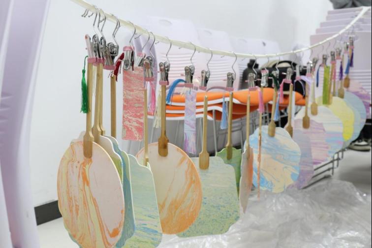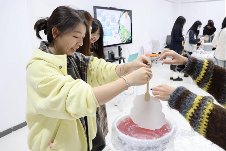 活动伊始,工作人员详细讲解了漆艺的历史渊源以及漆扇的文化内涵,从大漆调制、颜料配比到绘制技法依次展开,并现场演示了“流漆”“点彩”“勾金”等传统工艺。在随后的体验环节中,师生们化身为“非遗创作者”,依照“滴漆入水不超四色、团扇轻浸缓提、自然晾干成形”的操作要领,充分发挥自身创意。各色环保漆料在水中交融晕染,参与者手持素扇,或匀速转动,或轻缓提拉,一道道独特的色彩与纹理就此定格于扇面之上。