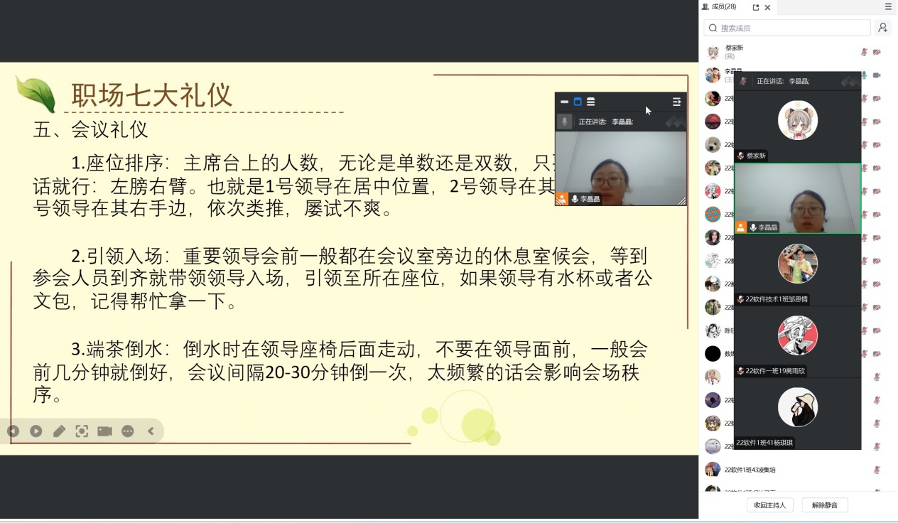 会议由辅导员李晶晶主持,通过线上腾讯会议平台进行,2025届毕业生100余人参加。李晶晶老师首先介绍了职场礼仪的重要性,强调了在职场中,良好的礼仪不仅是个人形象的体现,更是职业素养的展现。她详细讲解了职场沟通的黄金四步法则——P-R-E-P原则,即先说结论(Point)、引用数据(Reason)、举例说明(Example)和重申结论(Point),这一原则有助于毕业生在职场中清晰、有效地表达自己的观点。