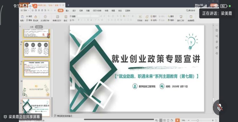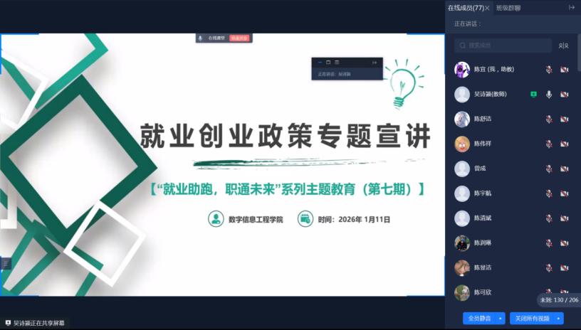 为切实提升我院实习生对当前就业创业政策的知悉度,1月11日晚,我院毕业班辅导员面向2026届实习学生开展了就业创业政策专题宣讲活动。
