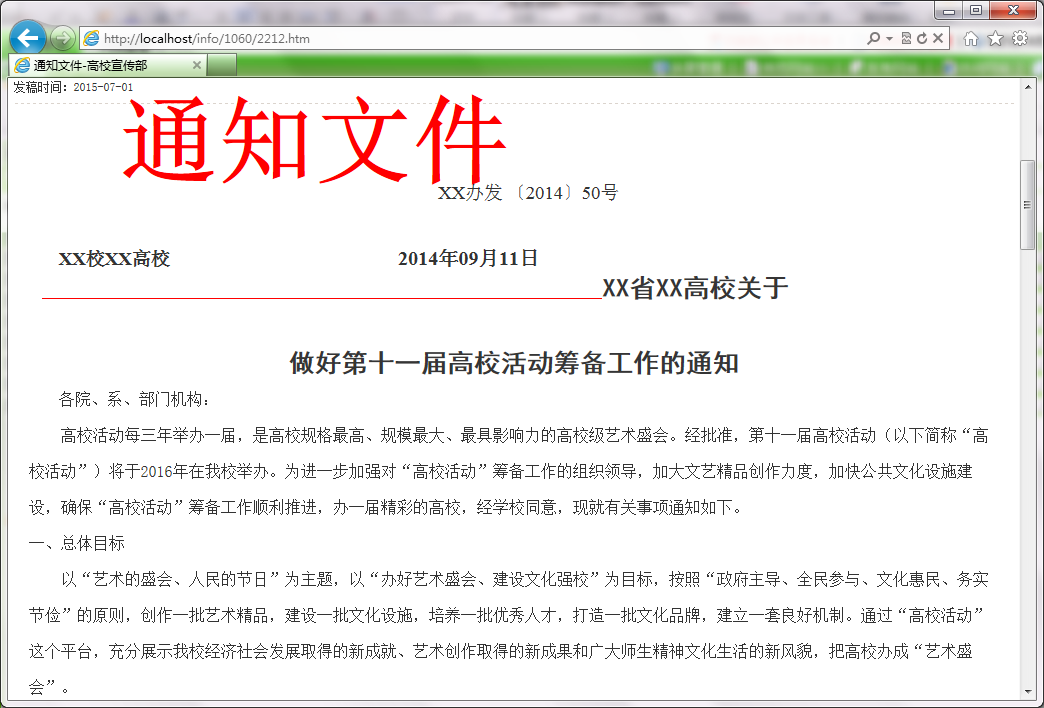 日常维护资料的时候,我们经常会遇到文章排版混乱的问题,比如将通知文件导入编辑器后,文件排版就变乱了,时间不居中,标题也换行了。页面显示效果见图1: