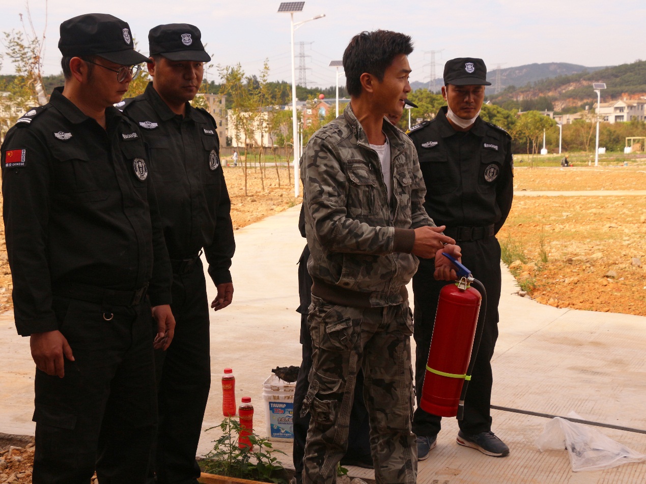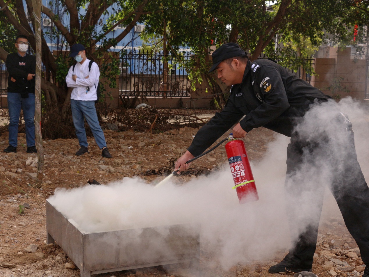 疏散演练结束后,福清校区保卫处组织校园义务消防队及保安人员进行灭火实操演练,演练内容包括灭火器的检查和使用步骤,有效使用距离、角度和站位等,参加演练人员分组进行了现场灭火操作。