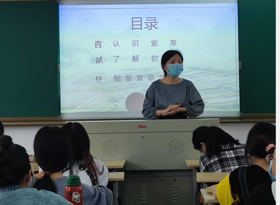 两位指导老师详细介绍了紫草的作用、功效以及紫草膏的制作工艺,耐心地将紫草软膏制作所需材料展示和详细解说,21药学1班的同学们发挥专业优势,动手制作了紫草软膏,受到了师生的一致好评。