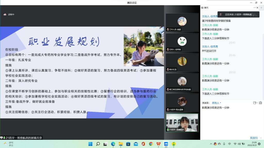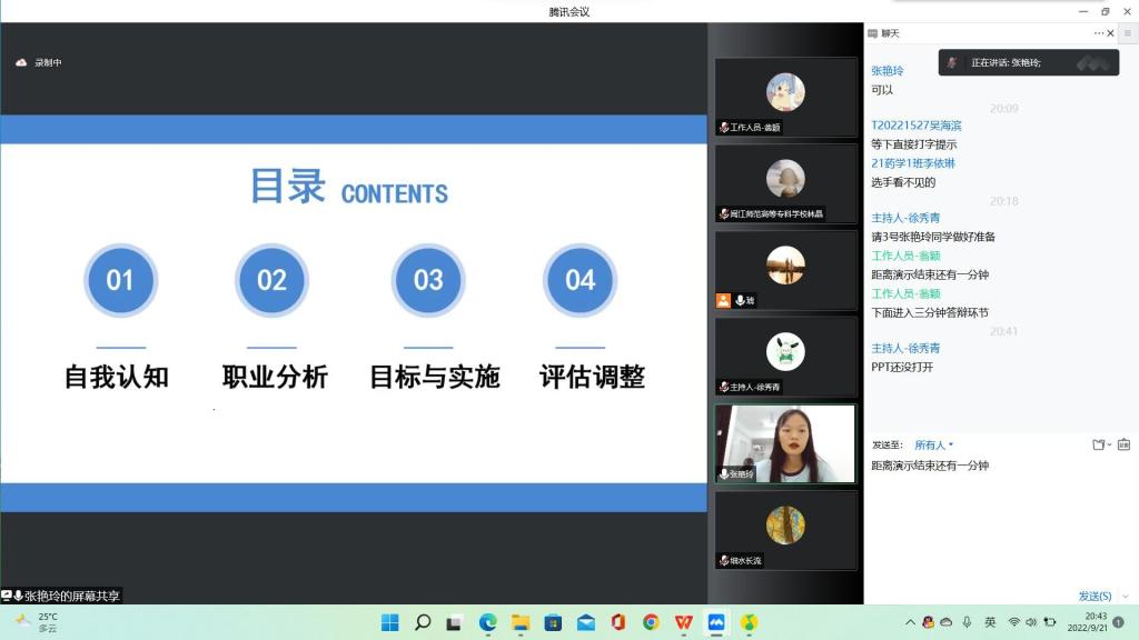 本次比赛采取线上形式开展,各位选手结合PPT演示稿,通过自我认知、优劣势分析、职业决策与前景分析等方面对自身的职业生涯进行了规划,绘制出各自未来的美好蓝图。随后,评委对每位选手的演讲进行点评,并针对选手出现的问题提出合理的建议。