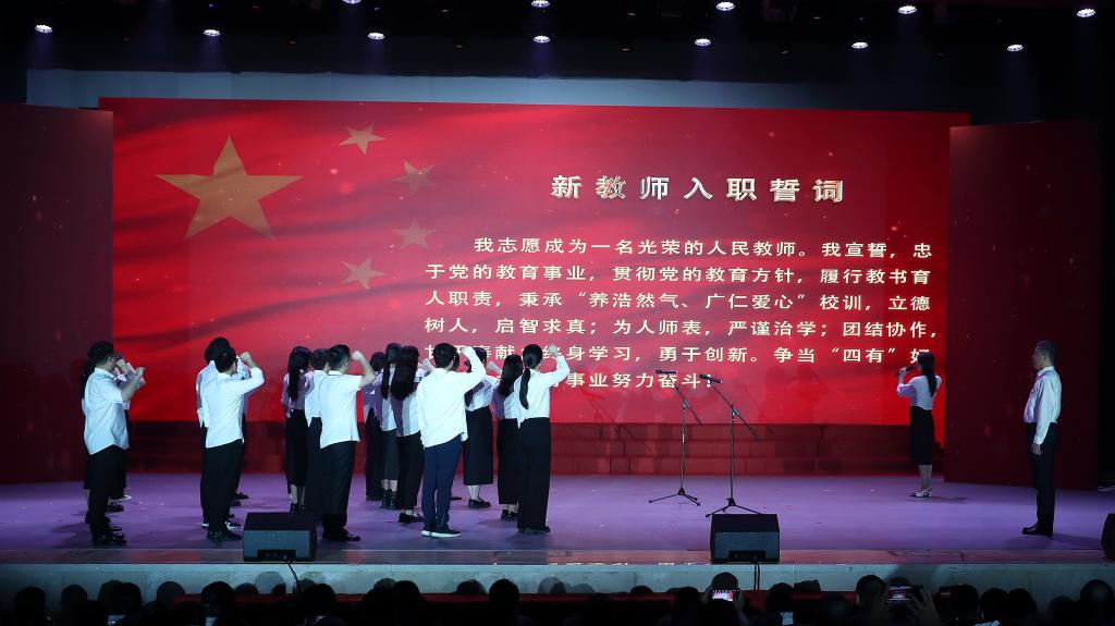 “三寸粉笔,三尺讲台系国运”,为了让新教师倍感学校关怀,充满归属感,快速成长为守师德、爱学生、会教学的合格教师。在教务处处长葛思华和党委书记陈荣生的带领下,22名新入职教师在国旗前庄严宣誓,“忠诚党的教育事业,履行教师的神圣职责,热爱学生,为人师表,严谨治学,乐于奉献,争当“四有”好教师!”