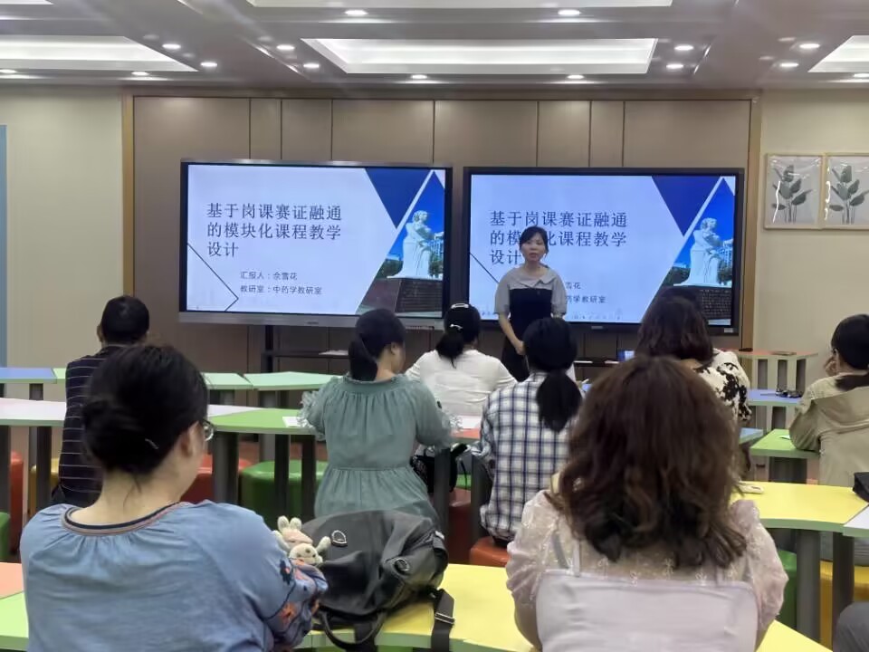 中药学教研室佘雪花老师面向福建省2023年新入职教师规范化培训跟岗学员及医护学院教师作了题为《基于岗课赛证融通的模块化课程教学设计》的讲座,从岗课赛证育人机制的理解、岗课赛证融通的课程设计、岗课赛证融通的教学设计等方面进行了分享,并通过岗课赛证融通教学案例进行了交流学习,强调了下企业实践的重要性以及下企业“学什么”、“做什么”,引发学员及教研室老师思考如何在今后的教学过程中对接岗位工作过程,对接证书、技能赛要求。