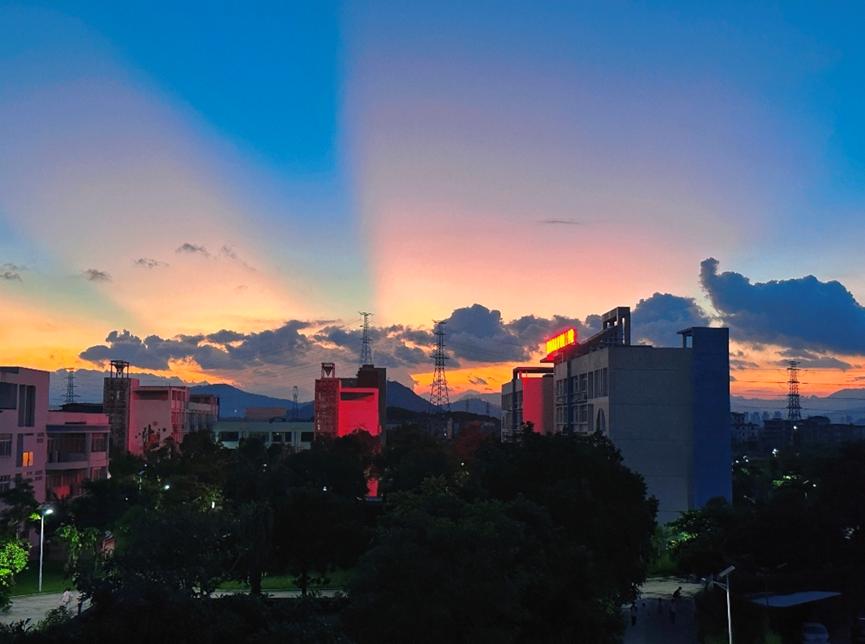 照片描述:拍下这张照片的时候才刚刚开学不久,傍晚下课吃完饭回到宿舍,抬头忽然看到这一幕心情超好,学校平时的夕阳也很美,但这片光影一下子就吸引到我了。在学校百廿之际,将这张照片分享给大家,希望大家天天开心。