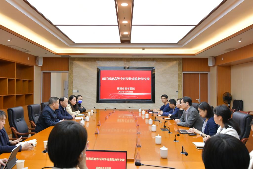 刘翔炜副校长介绍了闽江师范高等专科学校的办学理念、医护学院的发展历程,并重点介绍了医养健康专业群及康养职教集团建设情况。庄嘉元院长着重介绍了医护学院护理、康复治疗、中药学等专业近年来的办学成果,就应用型医药卫生人才培养路径进行交流,希望校院双方能在医疗服务和教科研方面进一步加强沟通交流,共同推动老年事业的发展。