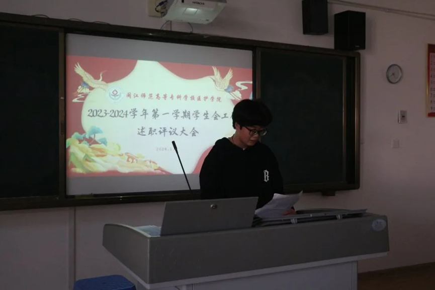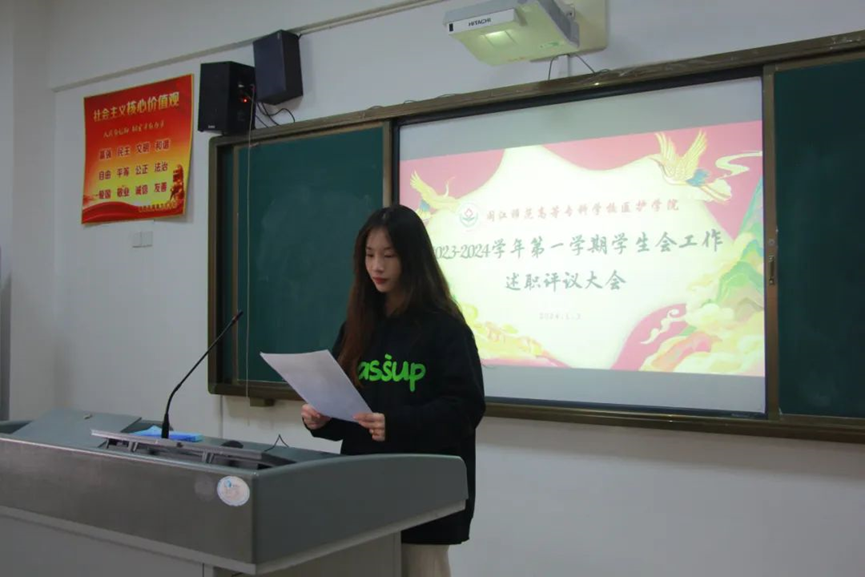 为进一步深化学院学生会改革,推动学生会管理工作科学化、规范化。2024年1月3日,医护学院团委学生会2023-2024学年第一学期学生会工作述职评议大会于福清校区信息楼三楼顺利开展。医护学院团委学生会全体人员参与会议。本次大会由执行主席黄雅雯主持。