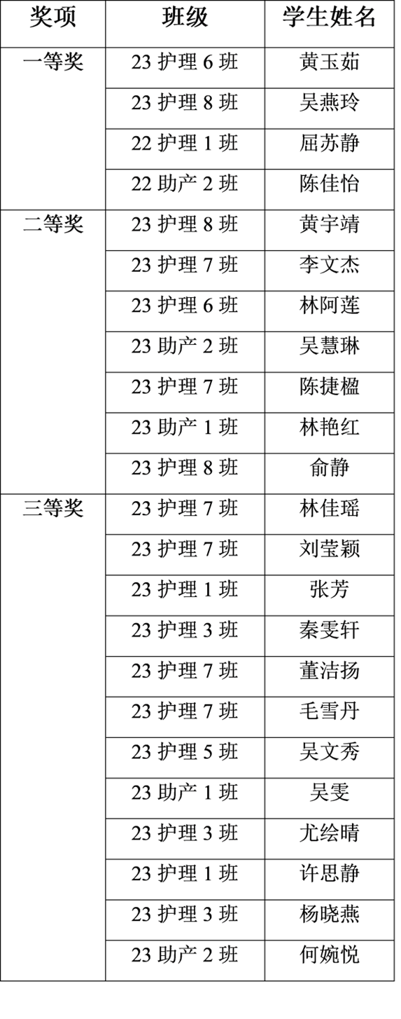 本次大赛一共经过6轮淘汰赛的精彩角逐,包括了选手1分钟自我介绍面试、两轮专业理论考核、5分钟CPR操作、静脉输液操作及为卧床患者翻身叩背吸痰等操作。现将比赛结果公布如下: