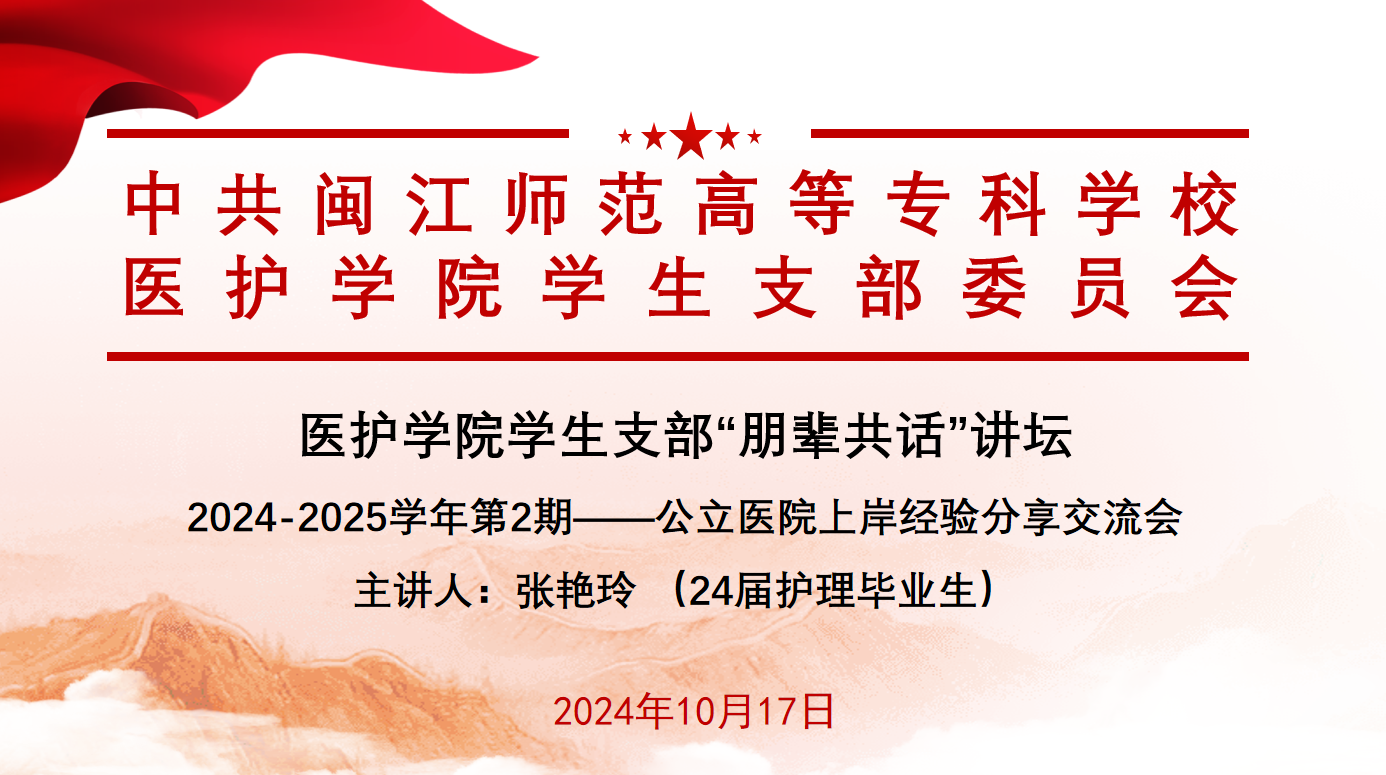 为推动学院党建工作发展,提升学院学子的职业素养并提供实用的就业指导和建议。2024年10月17日,医护学院学生支部开展“朋辈共话”讲坛24-25学年第2期活动——公立医院护理岗位备考经验分享交流会。此次活动邀请24届护理专业毕业生张艳玲主讲。