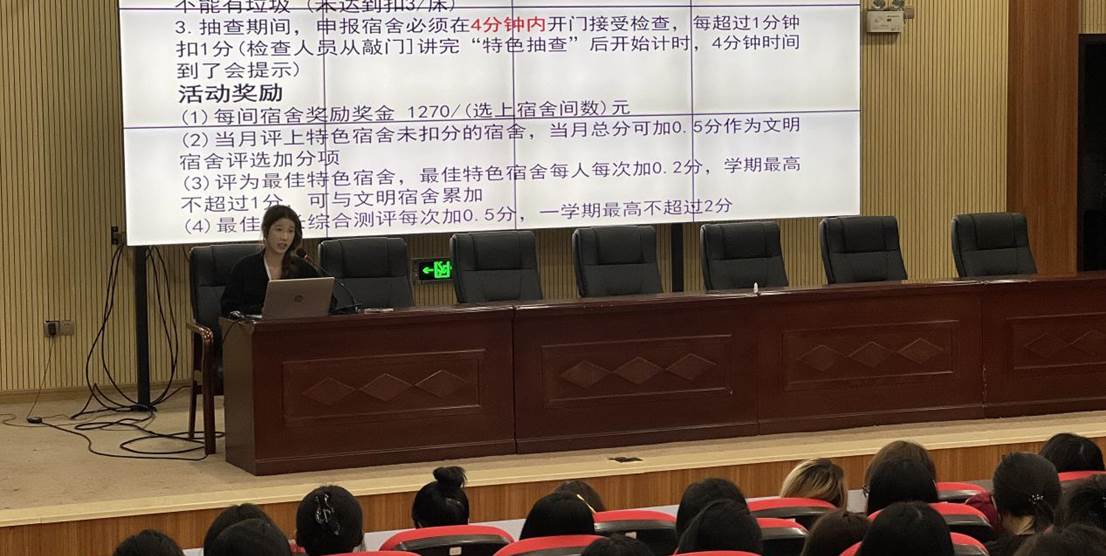 在本次活动中,医护学院自律会宿管部部长廖雨洁详细介绍了文明宿舍的选评目的、选评标准、奖励机制。并且邀请了文明宿舍的获奖宿舍来到现场,从宿舍卫生、文化建设、团队协作等方面与医护学院的同学们分享经验和心得。