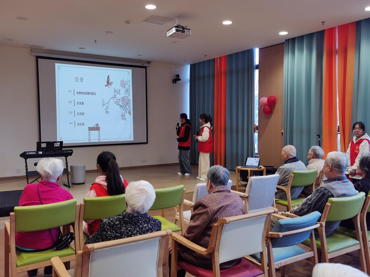 活动现场,志愿者与老人们齐聚一堂,他们通过同老人们聊天、捶背等方式拉近了彼此之间的关系。随后,志愿者开展健康宣教环节,为老年人宣讲“冬季养生”的要点和注意事项,在宣教过程中,他们询问老人的身体状况,提醒老人们注意防寒保暖,及时添衣。