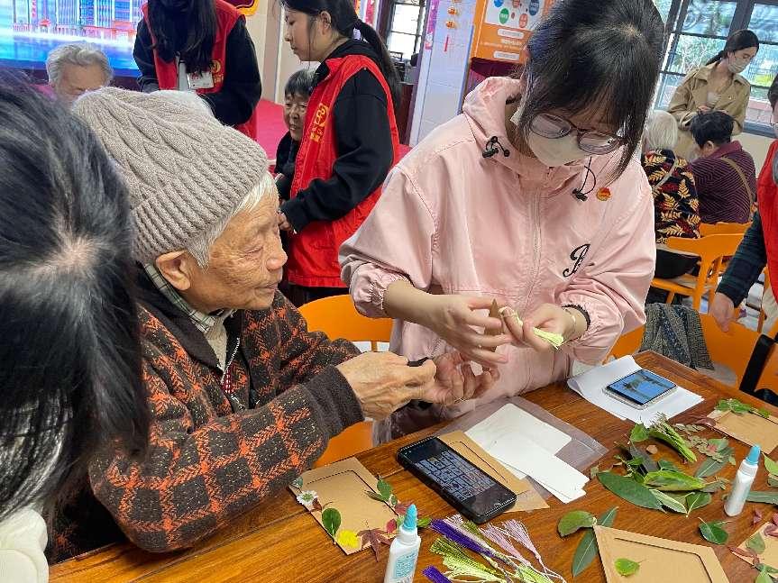 活动的最后,志愿者们与老人一同制作干花书签。大家精心挑选干花,搭配丝带,在欢声笑语中完成了一份份独一无二的作品。这些书签不仅留住了春日芬芳,更承载着温暖情谊。