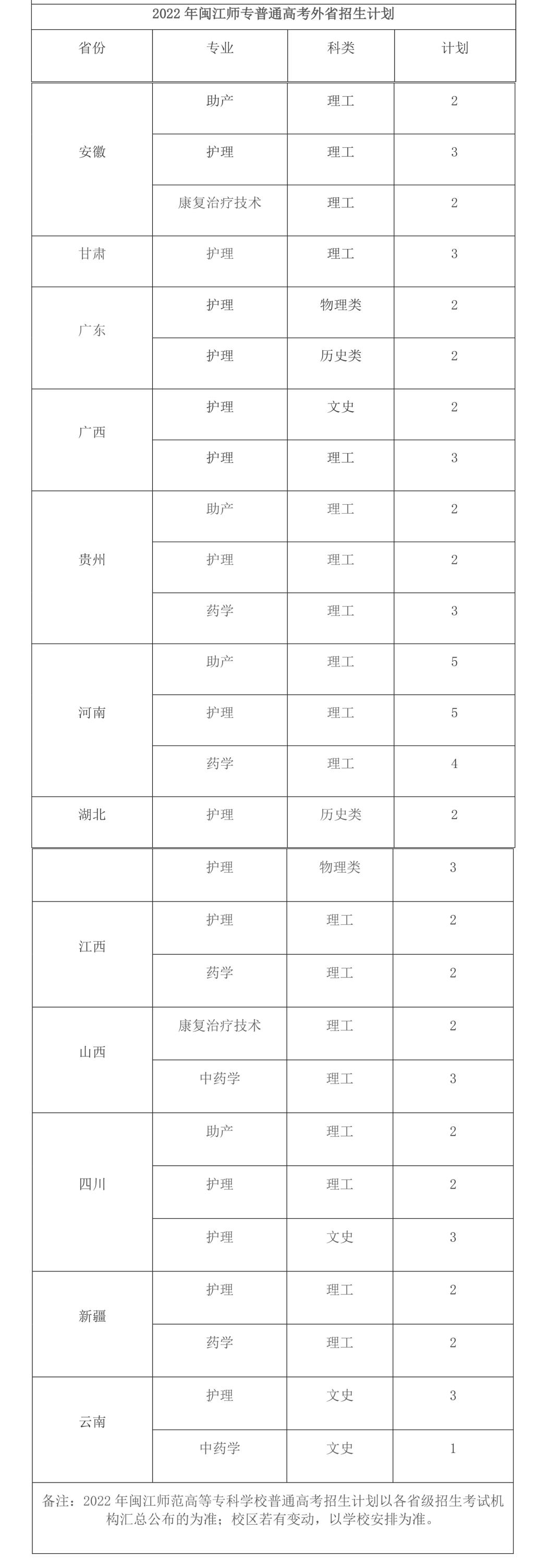 2022年普通高考福建省外招生计划