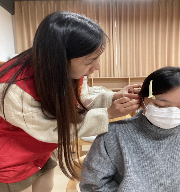石玥同学说:本次耳穴志愿服务让我学习到了耳穴的定位、功能,操作耳穴压豆的技术,在自己亲身体验之后发现按压耳穴时会有一些疼痛或者酸胀感,希望有机会再多试试别的部位