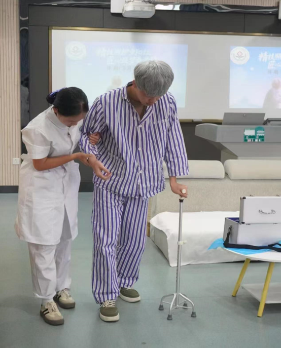 比赛聚焦养老服务一线需求,以现实的案例设置考核场景。选手们化身居家养老照护人员,面对患有帕金森综合征且病情恶化的老人,需在10分钟内完成专业且细致的照护任务。从指导老人使用四脚拐杖进行行走训练,增强其行动能力,到协助老人完成个人卫生清洁、合理规划饮食起居等基础生活照料;从关注老人身体健康,到通过耐心沟通缓解其因疾病产生的焦虑情绪,全方位考察选手的养老照护综合素养。赛场上,选手们沉着冷静、操作规范,充分展现出扎实的专业技能与良好的沟通应变能力。