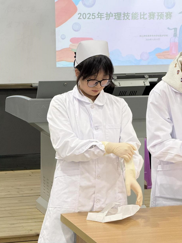 技能实操环节以“穿脱无菌手套”为重点,学生们严格遵循操作规范,从用物准备、手部消毒到无菌操作,全过程严谨熟练,体现了日常训练的扎实基础。