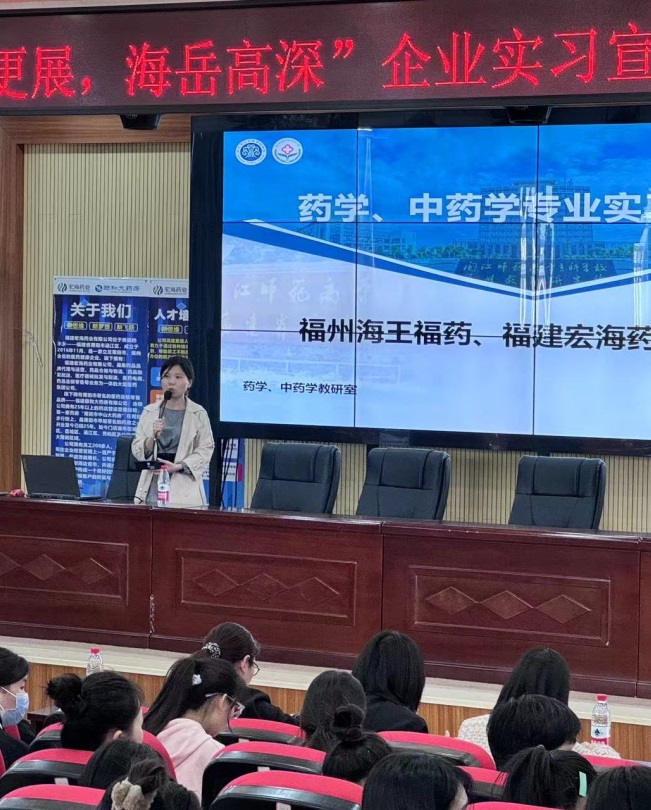 为进一步促进学生实习与就业,推动实习生与用人单位之间高精准对接,促进学生岗位实习高质量完成,医护学院于2024年3月27日在信息楼四楼报告厅举行“宏图更展,海岳高深”-药学、中药学专业实习就业宣讲会,本次参加宣讲会的企业为福建宏海药业集团有限公司和福州海王福药制药有限公司。