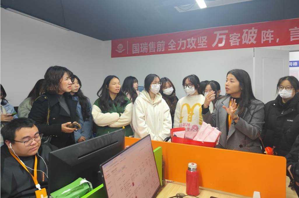随后,学生们被分成两组,分别进入电商运营部和电销组进行参观学习。在电商运营部,学生们亲眼见证了从产品上架、营销策划到客户服务等一系列流程如何在数字化平台上高效运作。部门负责人详细介绍了大数据分析在选品、定价、促销策略制定中的应用,以及如何通过社交媒体和内容营销提升品牌影响力。同学们听得津津有味,不时提出自己的见解与疑问,现场互动热烈,学习氛围浓厚。