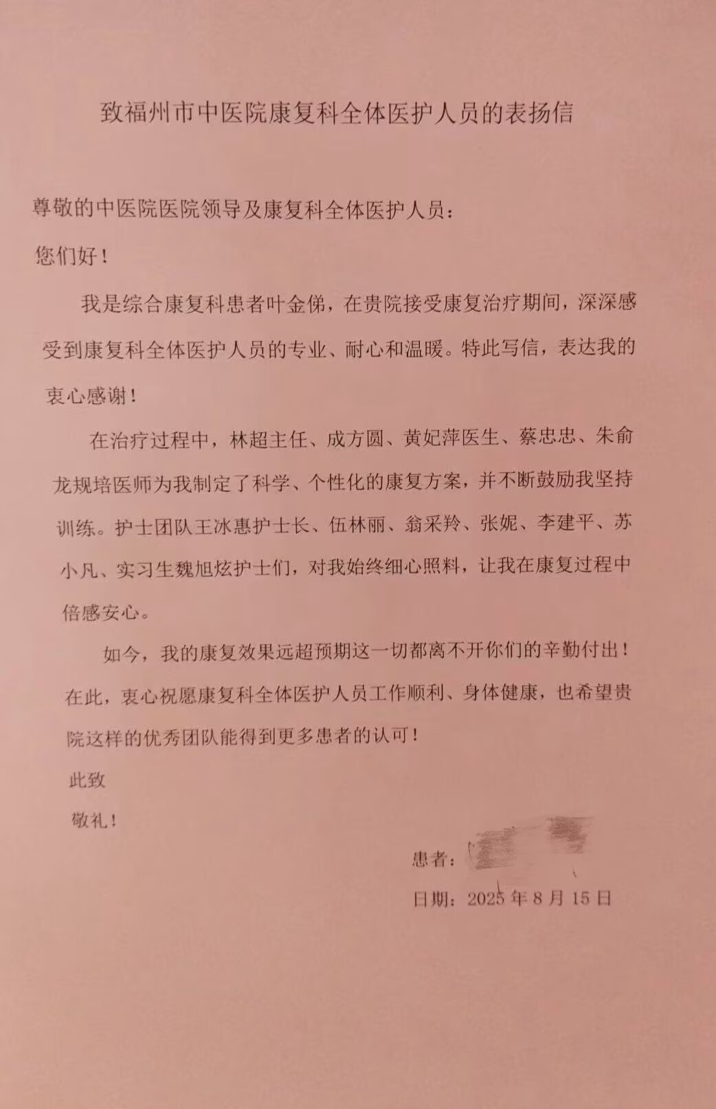 近日,闽江师范高等专科学校医护学院2023级护理专业实习生林欣然、张文渟、魏旭炫三位同学,先后收到来自福州市中医院鼓楼院区与五四北院区不同科室患者的五封感谢信,赢得患者及科室的广泛好评。