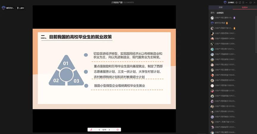 为帮助大学生认清当前就业形势,科学规划职业生涯,提升就业竞争力,医护学院毕业班辅导员们于9月14日线上组织开展了以“做好职业规划,助力高质量就业”为主题的晚点名活动,围绕我国就业形势与政策展开深入解读,为同学们提供精准就业指导。