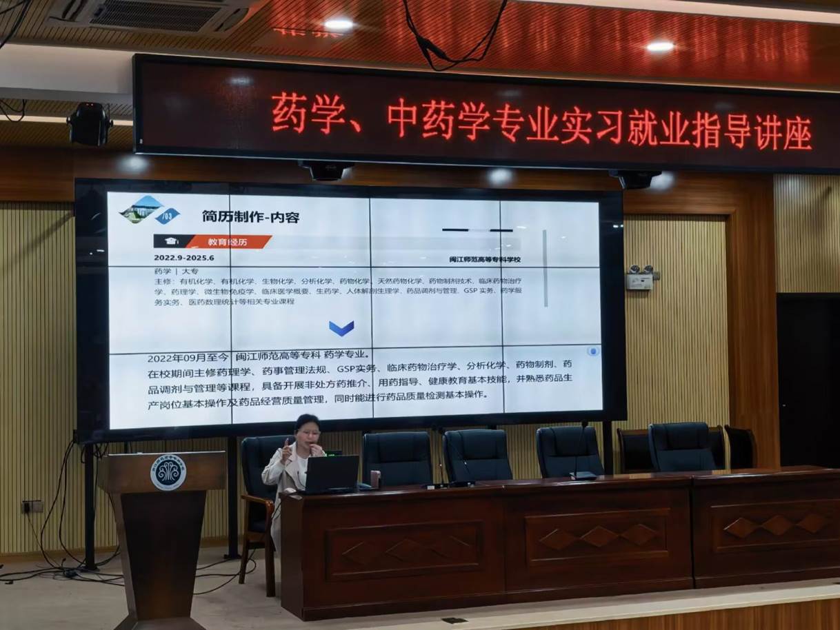 佘雪花老师围绕实习就业方向、岗位选择、简历制作及面试技巧等内容展开详细解读,重点介绍药厂、医疗机构、医药公司、药店四大就业渠道,深入剖析各岗位工作内容、职业发展与晋升路径,并结合行业现状为学生提供务实的择业建议。此外,她还针对简历优化、面试准备开展专项指导,提醒学生明确自身职业定位,合理规划学历提升与药师考证事宜。