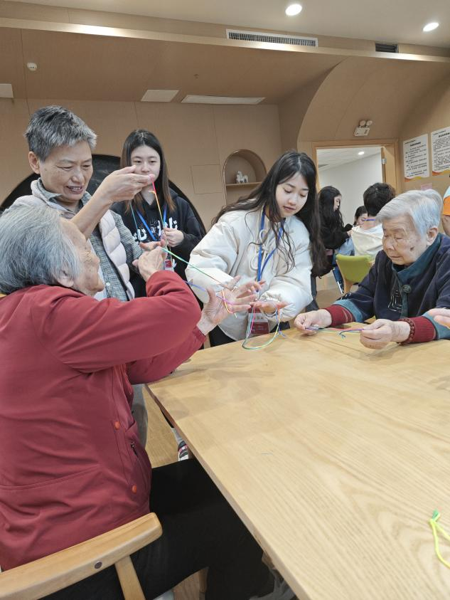 活动中,志愿者们引入了翻花绳游戏,这是一项既简单又充满乐趣的传统活动。他们耐心地指导老人们掌握翻花绳的技巧,老人们也兴致盎然地投入学习。很快,活动室内便回荡着翻花绳的节奏和老人们的欢声笑语。这种互动不仅提升了老人们的手眼协调能力,还让他们重温了童年的欢乐时光。