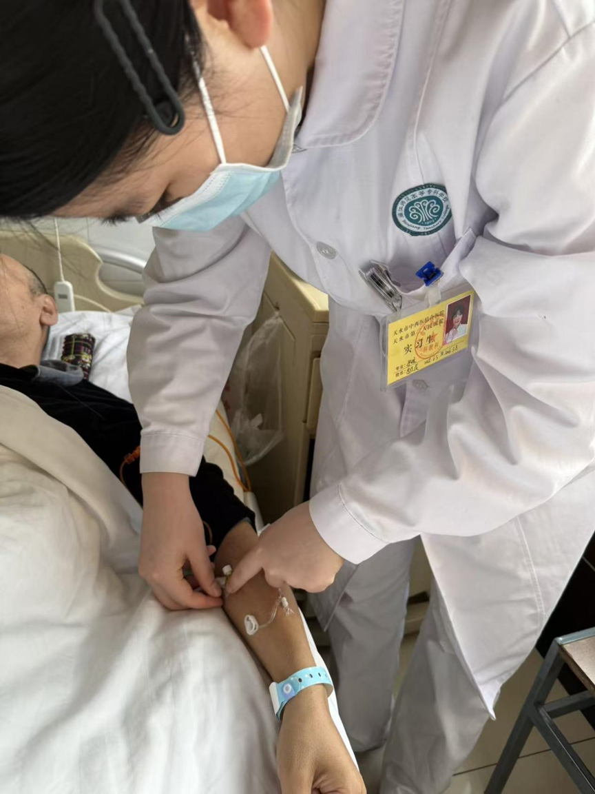 实习期间,李佳陵同学在带教老师的指导下,不仅认真完成生命体征监测、基础护理操作等工作,还格外关注肿瘤患者的心理状态。面对因化疗产生不适的患者,她耐心安抚情绪、协助调整饮食;闲暇时陪患者聊天解闷,用细致的关怀驱散病房的沉闷。