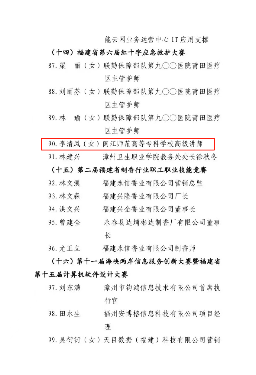 日前,福建省总工会下发《关于表彰2021年全省劳动和技能竞赛优胜集体和个人的决定》,闽江师范高等专科学校医护学院教师李清凤在福建省第六届红十字应急救护大赛中斩获佳绩,荣获“福建省金牌工匠”荣誉称号。