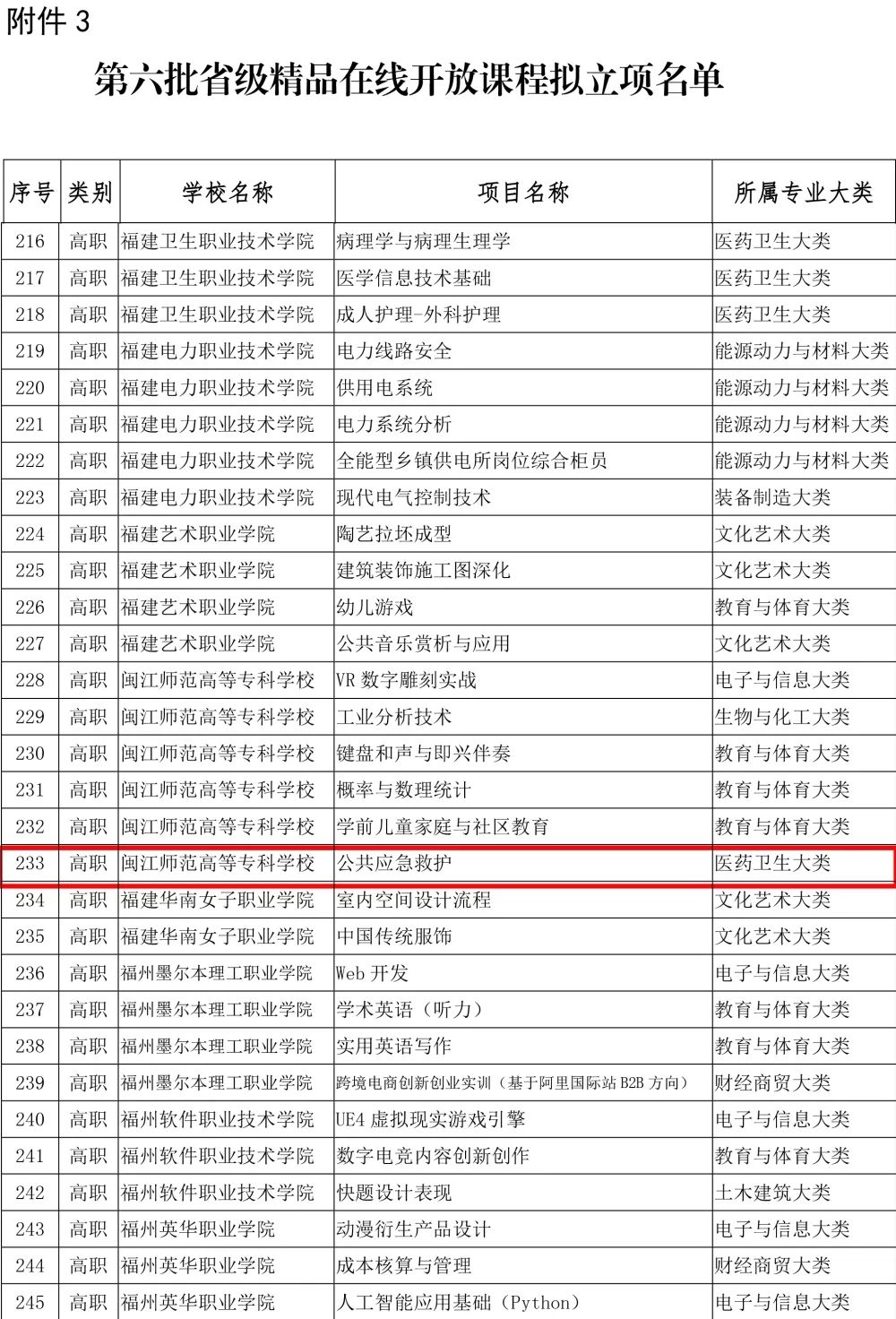 近日,福建省教育厅发布2022年省级职业教育信息化项目拟立项建设名单公示,经院校申报、专家评审,医护学院《公共应急救护》课程被纳入第六批省级精品在线开放课程拟立项名单。