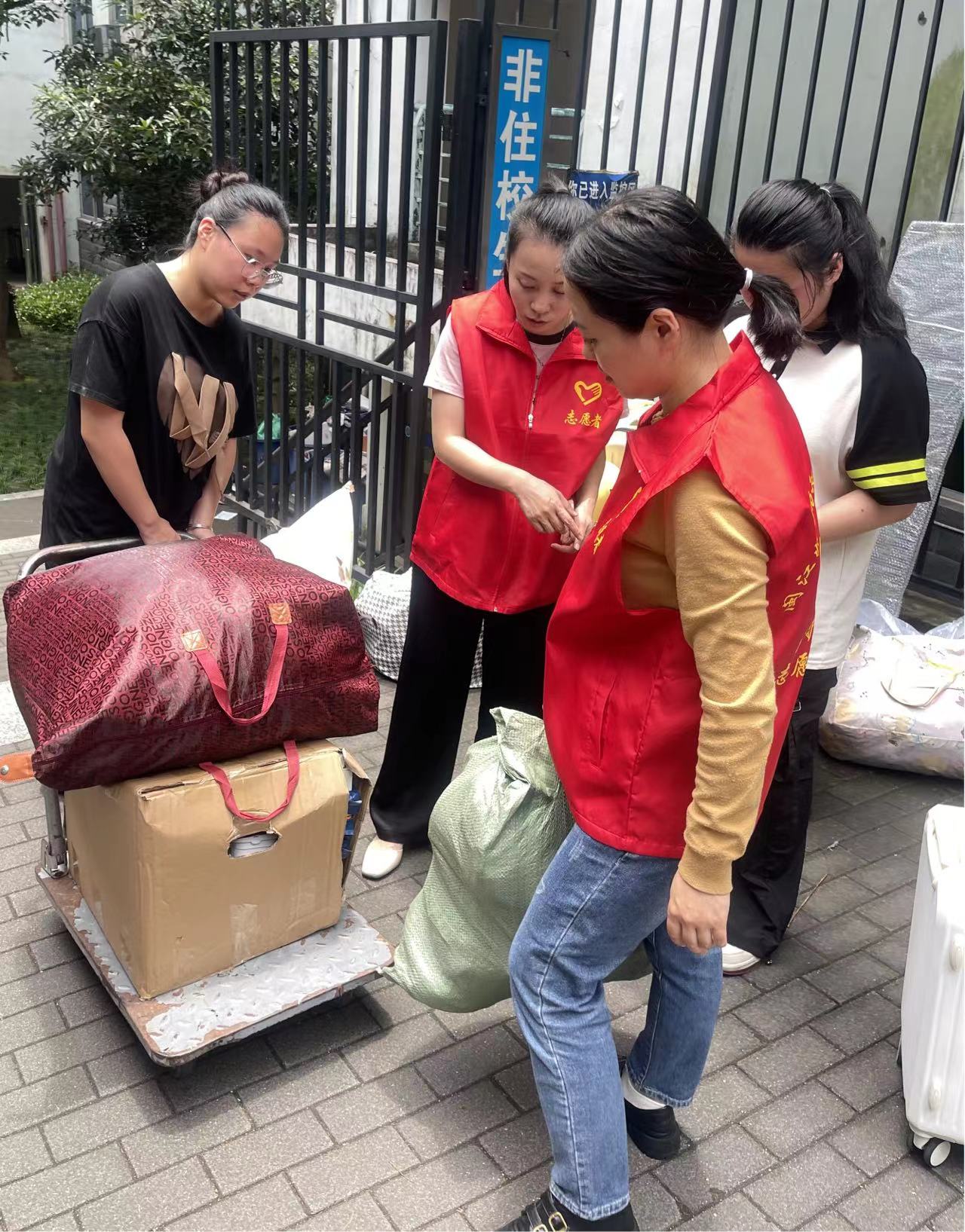 志愿者们按照事先安排好的计划,分工合作。虽然工作量很大,但志愿者们没有丝毫怨言,每个人都全力以赴,用自己的实际行动为实习生们提供帮助。支部老师们也积极用私人车辆帮助同学搬运大件行李。