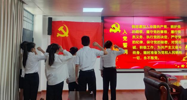 宣誓仪式由支部书记闻迪领誓。新党员们面对党旗,右手握拳,庄严宣誓,表达对党的忠诚和信仰,对共产主义事业的无限热爱和坚定追求。党旗下,新党员们的决心表态回荡在会议室,震撼着在场的每一位党员。支部老党员代表陈胜同志向新党员们表示热烈的祝贺,鼓励新党员们要珍惜党员身份,不忘初心、牢记使命,努力在实践中锻炼成长,为实现中华民族伟大复兴的中国梦贡献青春力量。