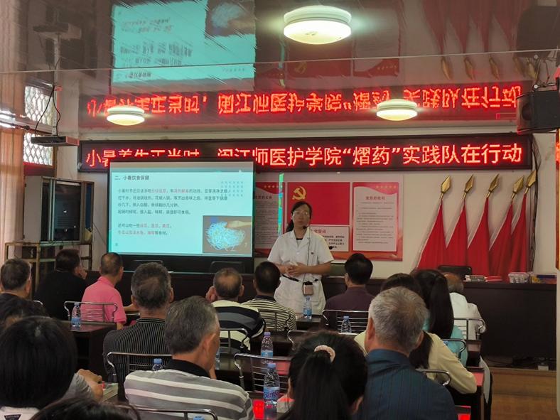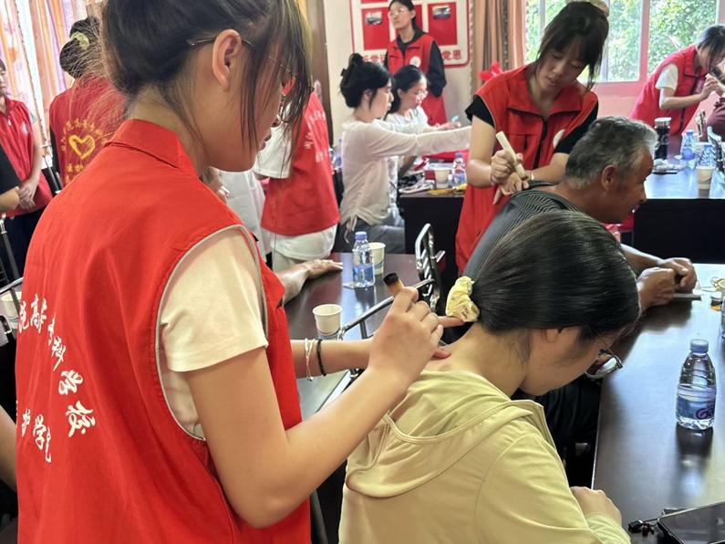 活动现场,两支志愿服务团队分工明确、默契配合。熠药实践队中护理专业的师生们有条不紊地为村民测量血压、血糖;中药学与药学专业的师生则生动地分享小暑养生食疗方,从食材搭配到烹饪技巧,细致入微的讲解引得村民们纷纷掏出手机拍照记录。青禾实践队的中医药专业师生运用专业手法,为村民进行推拿和艾灸,缓解颈肩腰腿疼痛,一位大爷做完理疗后舒展着身体,笑着竖起大拇指:“舒服多了,太感谢你们了!”