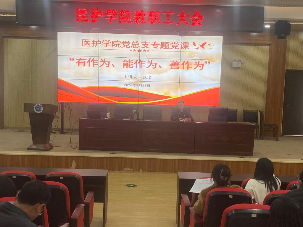 为深入学习贯彻习近平总书记关于担当作为的重要论述精神,进一步激发学院教职工干事创业的内生动力,2026年3月11日,医护学院党总支开展全院教职工专题党课。本次党课由党总支副书记(负责日常工作)张瑛同志担任主讲,以“有作为、能作为、善作为”为主题。