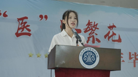 优秀毕业生代表黄雅雯发言。她讲述了从医学启蒙到肩负使命的蜕变,感恩恩师启迪医学之路。她誓言未来无论在急诊室抢救、手术室奋战或基层守护健康,学院"厚德、笃学、精技、惠泽"的院训将深植2025届毕业生的职业核心。