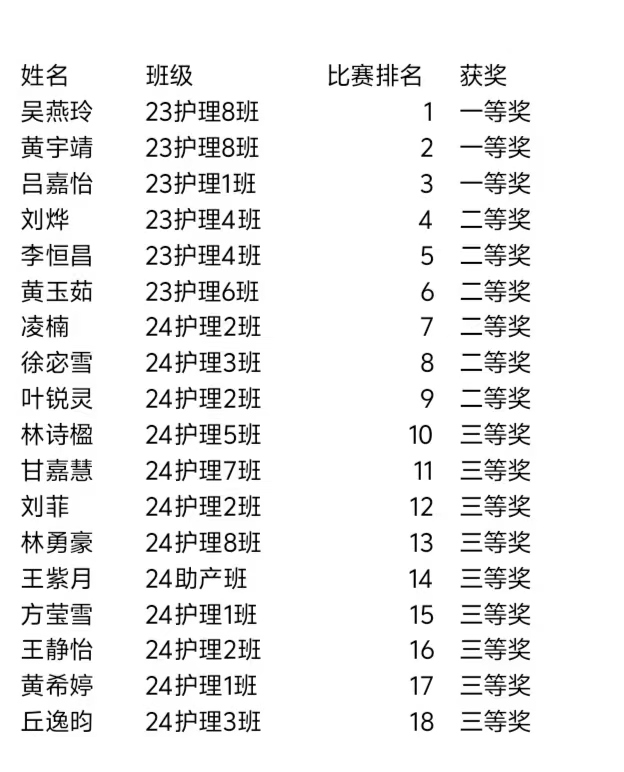 以上为本次护理技能决赛获奖名单,此次比赛不仅为护理专业学生提供了一个展示自我的平台,更是一次专业技能与人文关怀精神的双重提升。脱颖而出的决赛选手们正为即将到来的省级护理技能比赛紧张备战,希望她们不负时光、不负使命,勇创绩佳,为校争光。