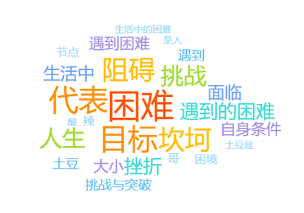 从讨论词云中可以看出很多同学都觉得土豆是困难、是目标;而软吸管是一种坚持、毅力与智慧。