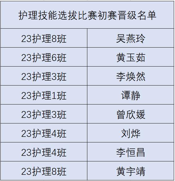经过一番角逐,以下8位优胜选手脱颖而出。他们身上有着作为护理学子严谨认真的专业态度,在细节上力求精准到位,严格遵守竞赛纪律全力以赴,充分展现了护理人员良好的心理素质和应变能力。