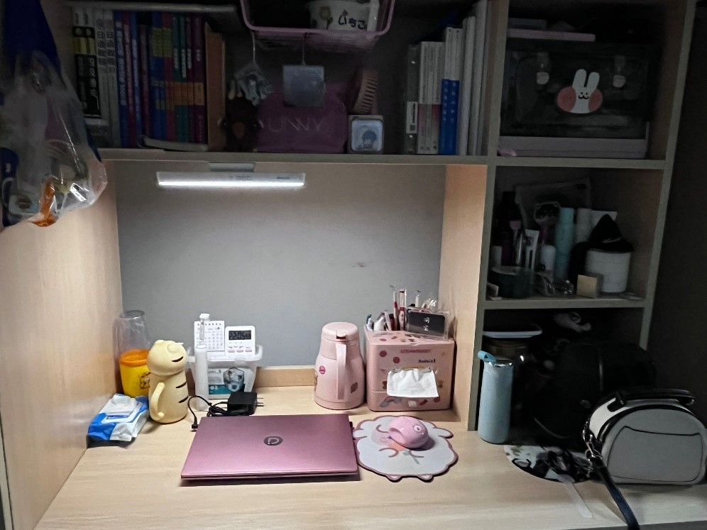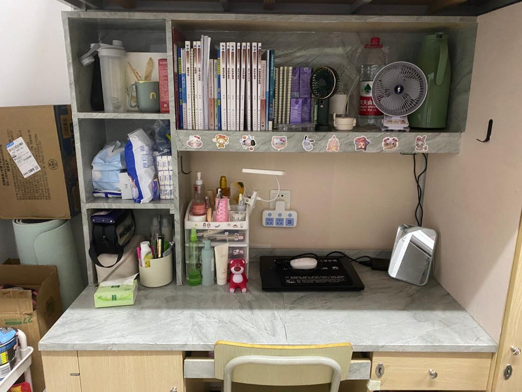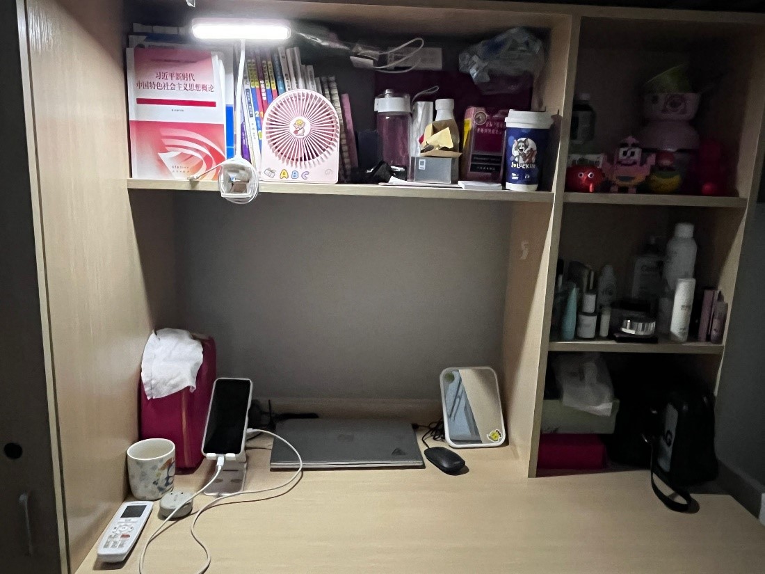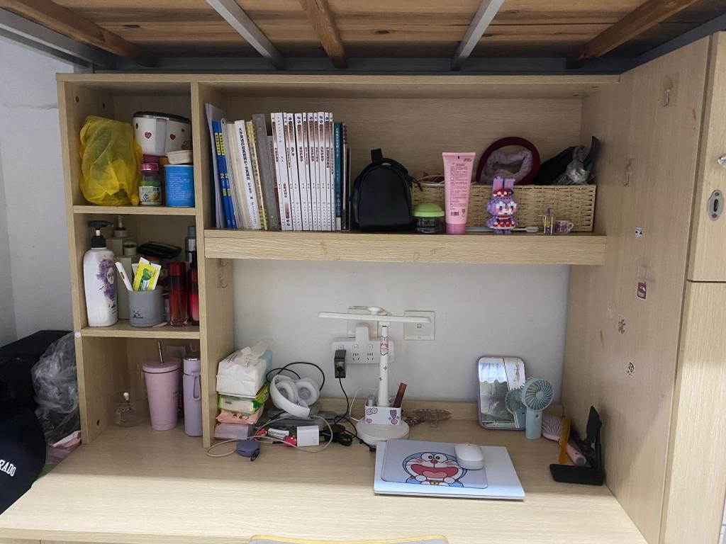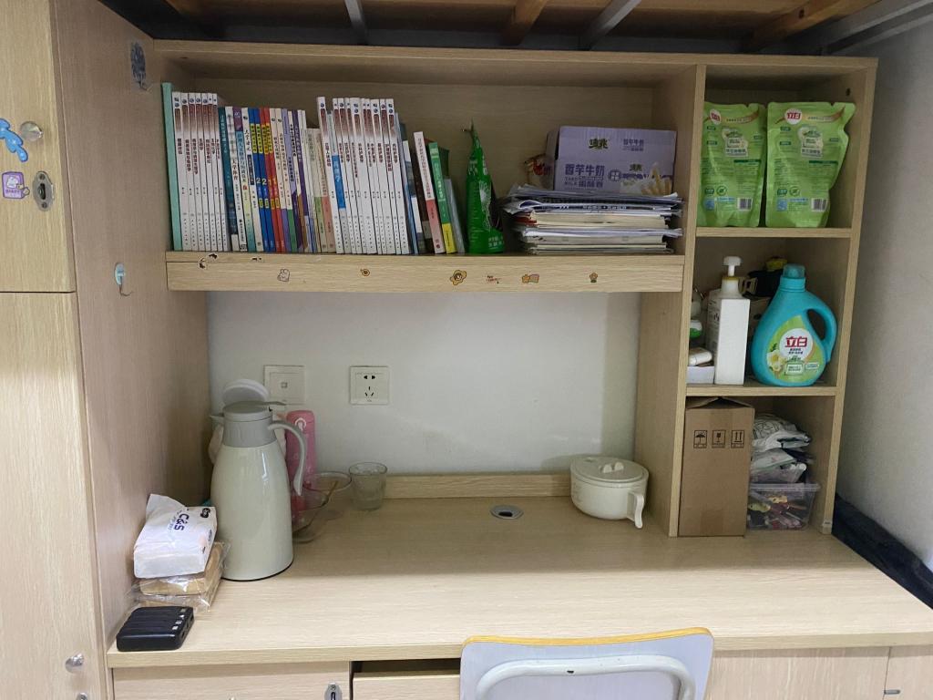 个人座位书架书籍摆放整齐,用物归类清楚,富有生活气息。