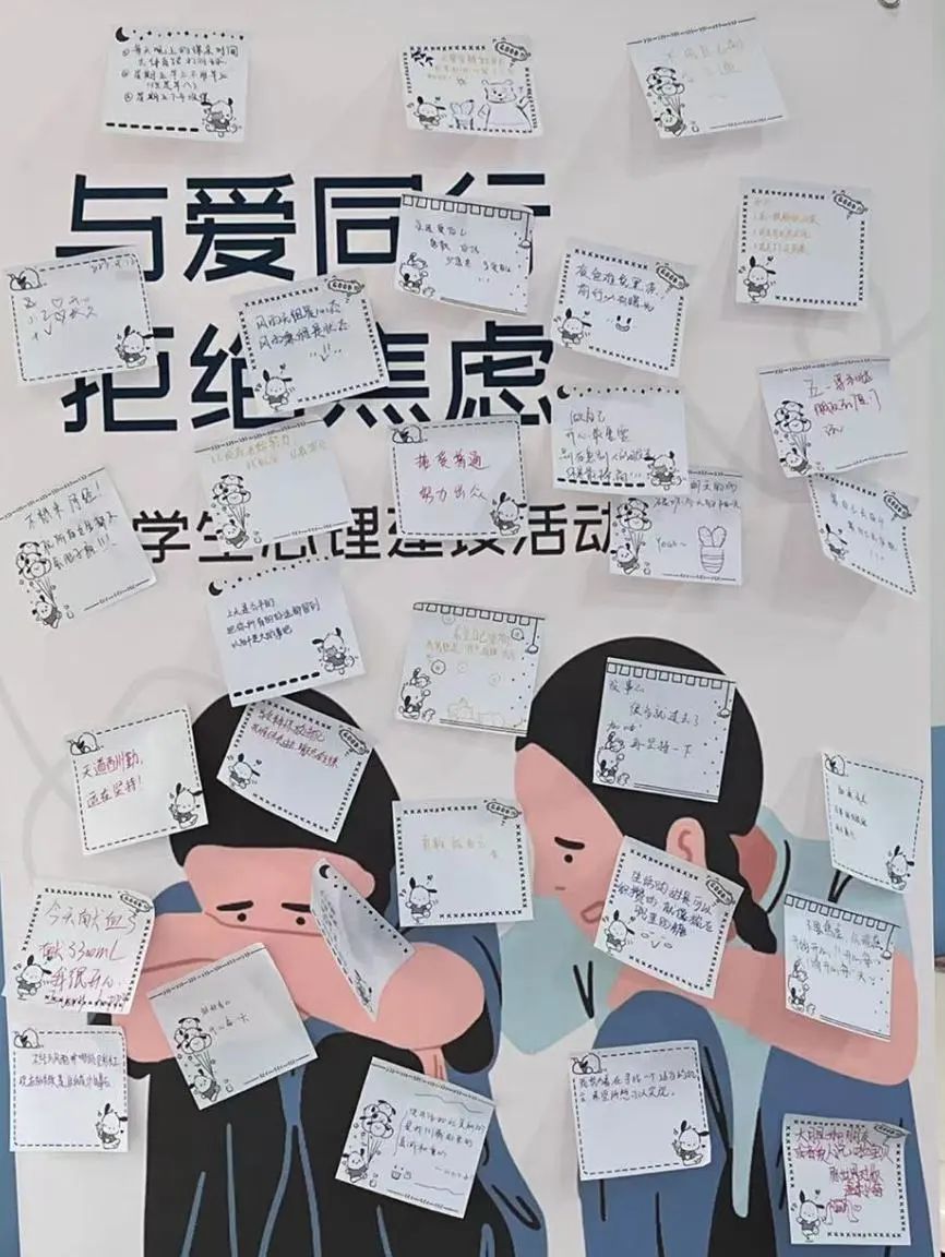 同学们在便签上写下自己的焦虑或者烦恼,然后将便签丢进禁止焦虑盒子里,再写下一张鼓励自己或开心的便签贴在心理展板上。