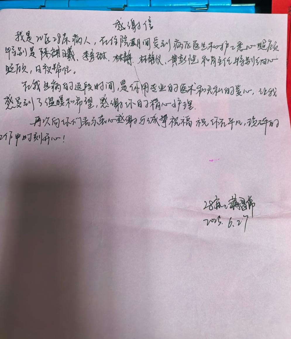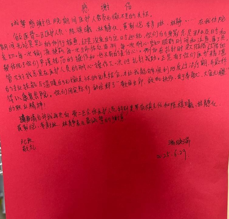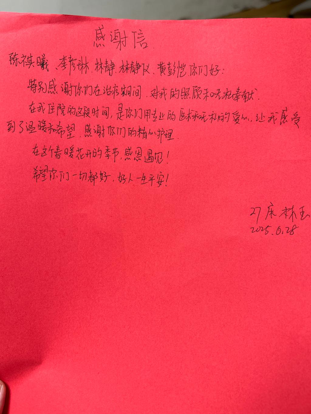 近日,闽江师范高等专科学校医护学院23级护理2班的陈祺曦、李彦琳、林静仪、林静、黄彭恺五位同学,在福州大学附属省立医院20区骨二科实习期间表现突出,陆续收到了四位患者手写的感谢信。她们的专业能力和温暖态度得到了患者和带教老师的认可。