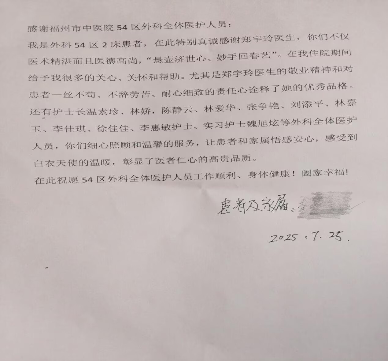 患者在信中写道,三位实习同学在护理过程中展现出了扎实的专业素养与温暖的人文关怀。无论是日常基础护理的细致周到,面对患者时的耐心沟通,还是在专业操作中的严谨规范,都让患者深切感受到来自“准白衣天使”的温暖与责任。