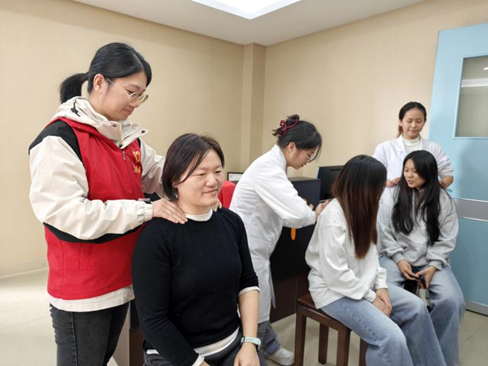 活动现场,支部党员教师带头示范,指导学生志愿者规范操作。康复治疗技术专业的师生充分发挥专业特长,为到场师生提供专业、细致的肩颈放松服务。