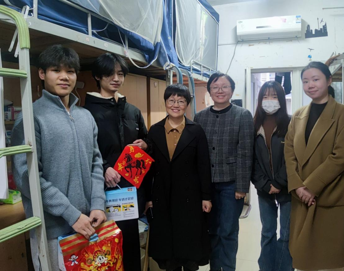 在学生宿舍,学院领导与同学们围在一起,亲切地聊起学习生活和假期安排。一声声关切的询问,一句句贴心的安全叮嘱,让小小的宿舍充满了融融暖意。走访中,学院领导和辅导员老师们还为学生送上了精心准备的小礼物,并致以诚挚的节日祝福。