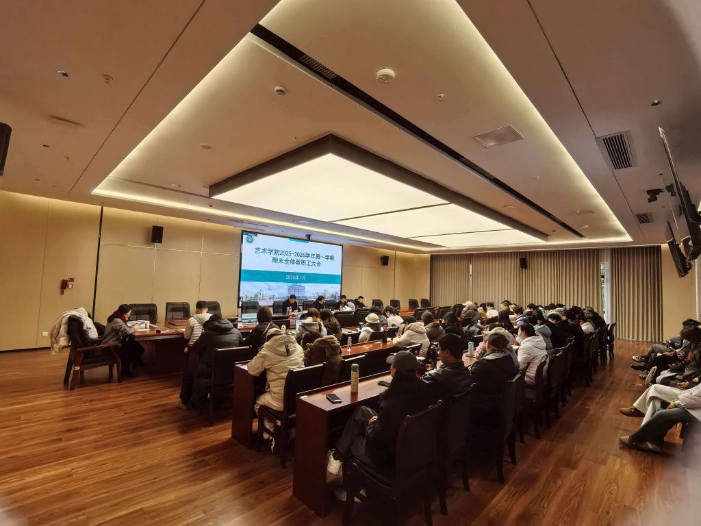 2026年1月23日下午,艺术学院在旗山校区图书馆一层会议室召开2025-2026学年第一学期期末全体教职工大会。会议由院长徐青主持,全体教职工参会。